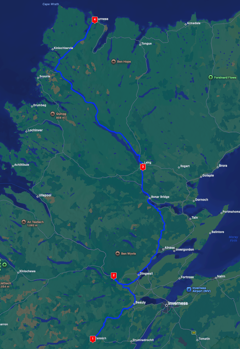 Die Strecke von Cannich nach Sango Sands Oasis ist nicht so sehr abwechslungsreich. Ich bin sicher, dass man, da auch viele Wege nach Norden führen, den geamten Tag mit Sehenswürdigkeiten vollballern kann, aber danach stand mir nicht wirklich der Sinn. Man könnte zum Beispiel an der Ostküste hoch und über John O'Groates fahren (was völlig öde ist, da Tourihochburg). Alle anderen Wege führen durch die Highlands in einer mehr oder weniger eintönigen Art und Weise und wir wollten ja eh nur an die Küste, nach zwei Tagen mitten drin ohne Meer :-). Einziger Abstecher war zu den Rogie Falls, was ganz nett war, aber auch nicht so berauschend.