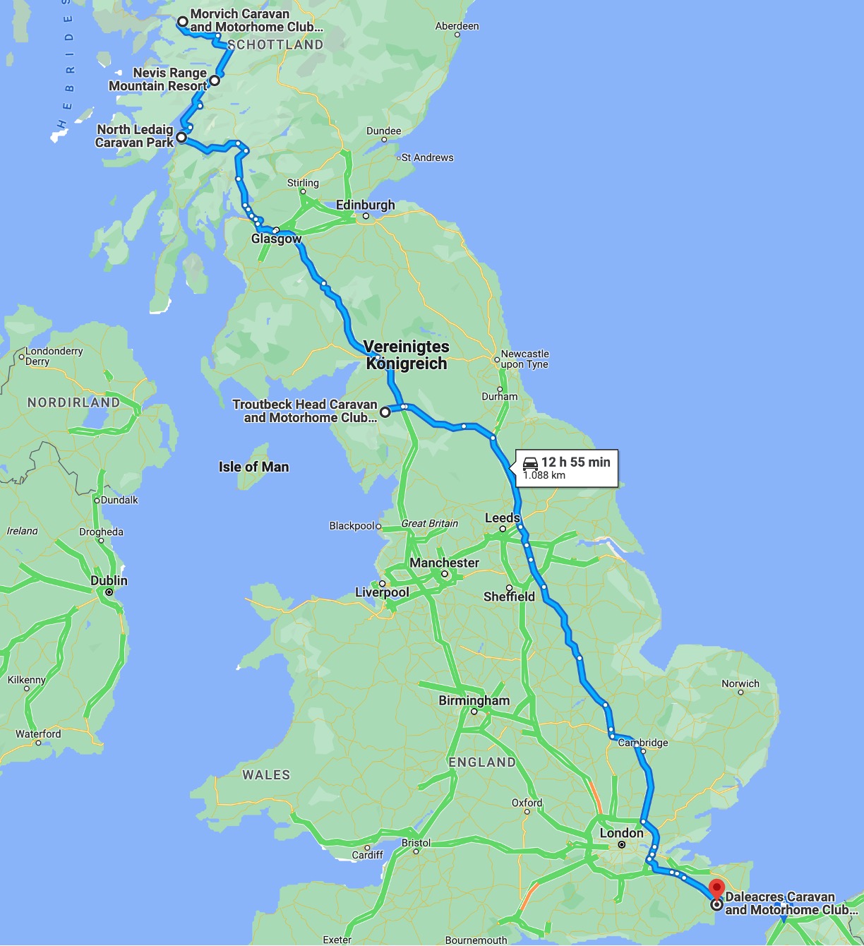 Der zweite Teil der Route zeigt den Weg zurück aus Schottland bis zum Tunnel. Die letzte Übernachtung auf der Insel wird wie die erste in Daleacres stattfinden. Der Platz liegt einfach zu günstig für den Tunnel und die Rückpassage soll sehr früh am Morgen sein.