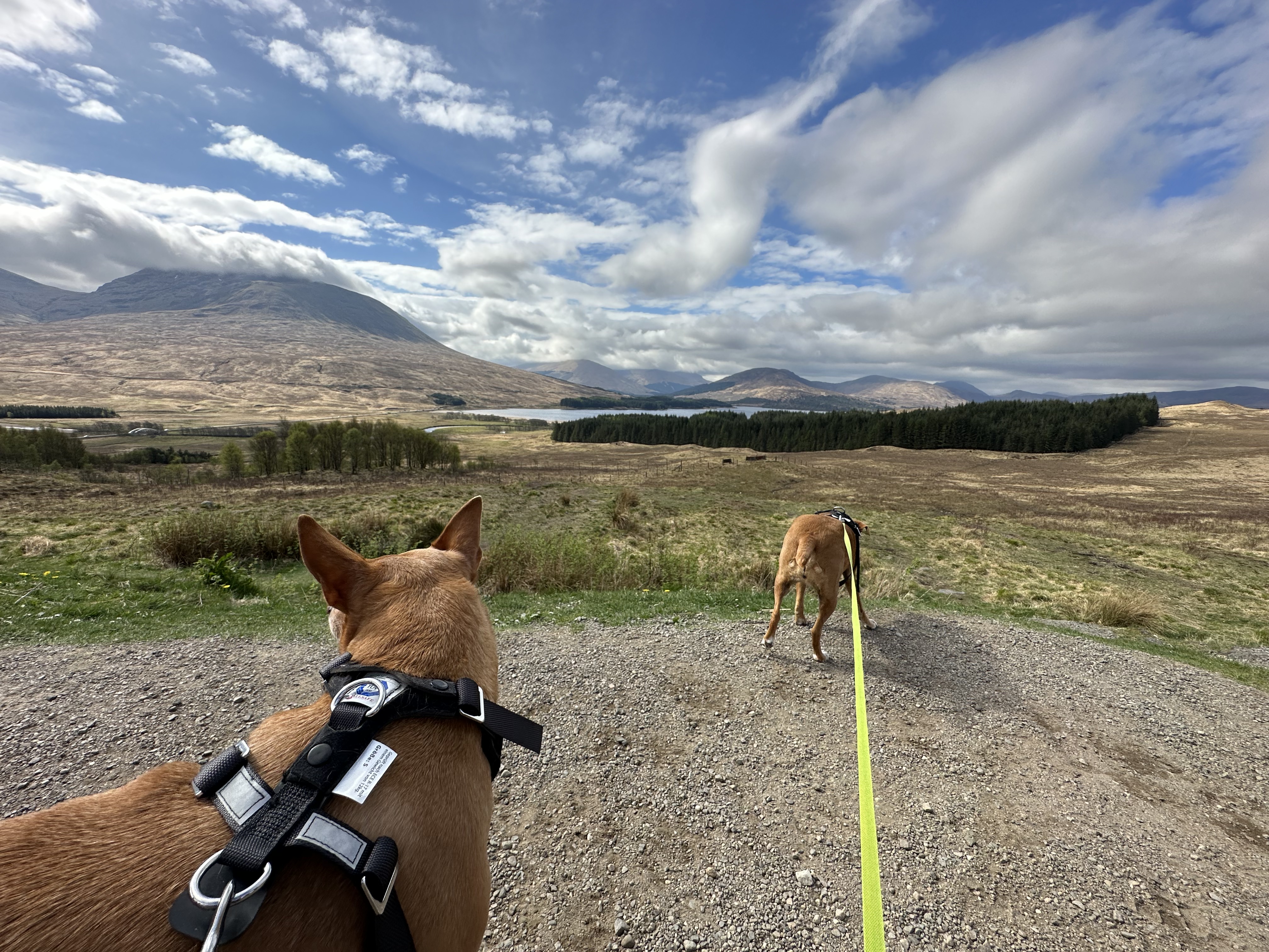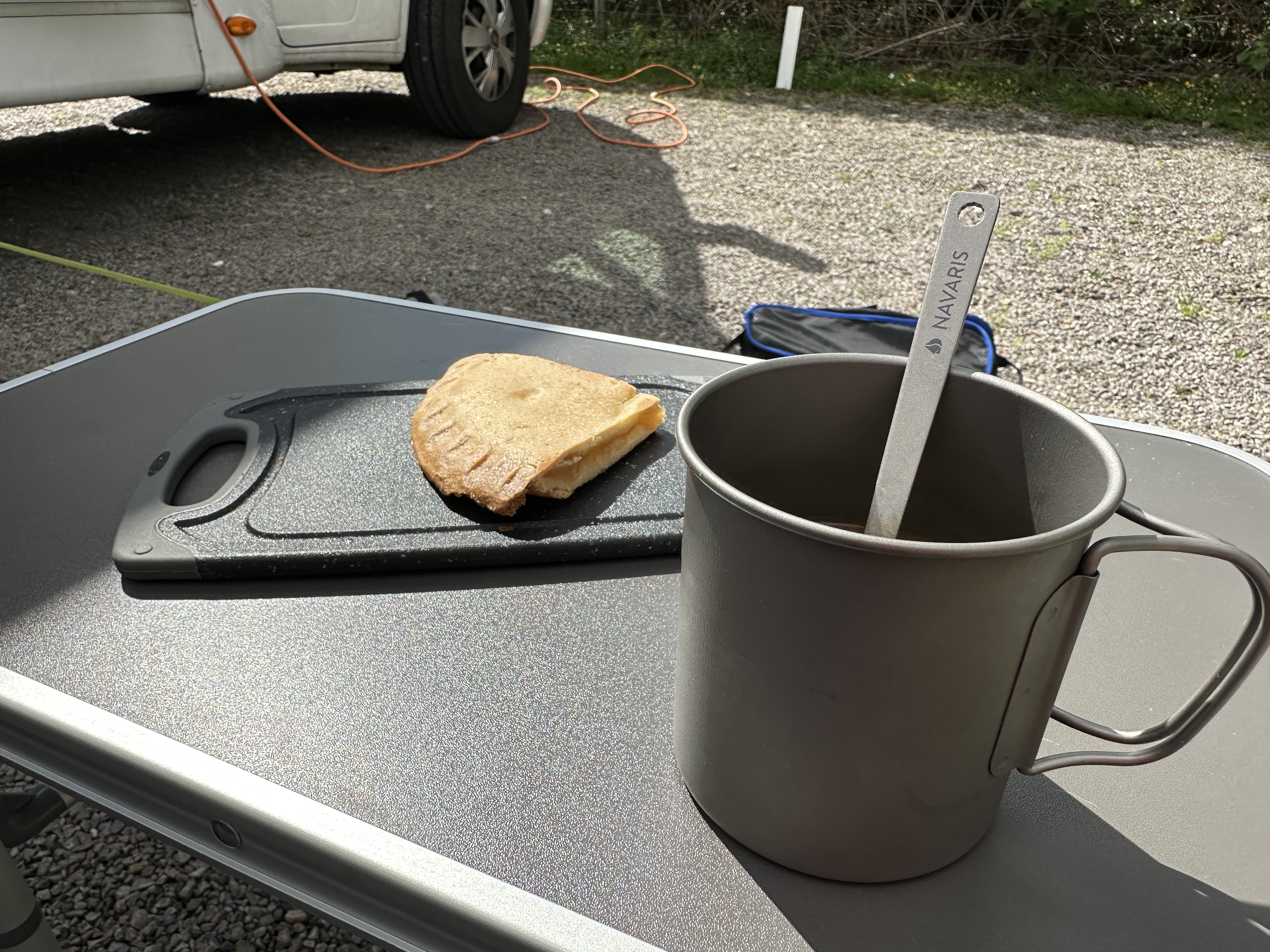 Das Wetter war so gut, dass Momo und Nana direkt mal vor dem funThom zur Ruhe kamen und ich dann ebenfalls Campingstuhl und Tisch aufbaute und draußen meinen Kaffee (löslich aber trinkbar) mit einem Stück Apfelkuchen zu mir nahm. Da kann man schon die Zeit verlieren und ich ertappte mich bei dem Gedanken, dass ich doch den Rest des Tages einfach rumgammeln könnte. Glüklicherweise kam ich recht schnell zur Besinnung. Man weiß ja nie wie lange man gutes Wetter in Schottland genießen darf, also sollte man das anders nutzen als faul rumzuhängen und Kaffe zu saufen (mit Kuchen versteht sich). Also ab in die Wanderschuhe und los. Eine gute Wahl, die Tour war etwas länger als 8 km und das tat allen 10 Beinen gut.