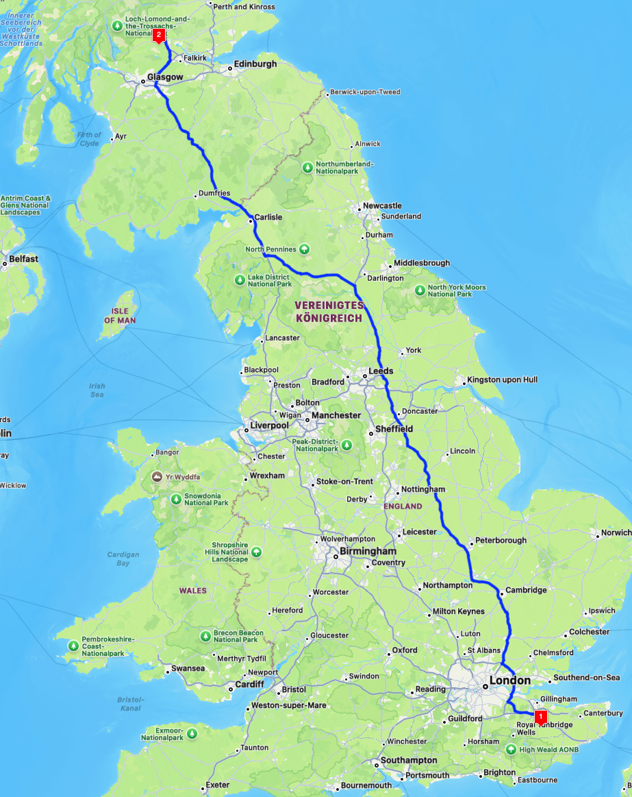 Reichlich spät und mit einem noch nicht ganz ruhigen Gewissen machten Momo, Nana, das funThom und ich uns dann auf in Richtung Schottland. Strathclyde Campsite war gebucht aber in Bearsted hatten mir die Betreiber schon gesagt, dass Strathclyde keinen late arrivals Platz hatte. Ich war also auf die Gunst der dortigen Kollegen angewiesen. Telefonisch hatte ich niemanden erreicht und so war absolut unklar, ob ich auf dem Platz zu einer späteren Zeit unterkommen könnte. Das Thema erledigte sich dann von selbst, da mich der Campingplatz seinerseits anrief um zu fragen, wann ich denn kommen würde. Ich erklärte mein Problem und bekam dann lapidar zu hören, dass ich dann keine Möglichkeit hätte auf dem Platz unterzukommen und in den Vertragsbedingungen ja stehen würde, dass ich mich selbst um eine Alternative kümmern müsse, wenn ich es nicht bis 20 Uhr schaffte. Das nenn ich mal Service, fast wie zu Hause...