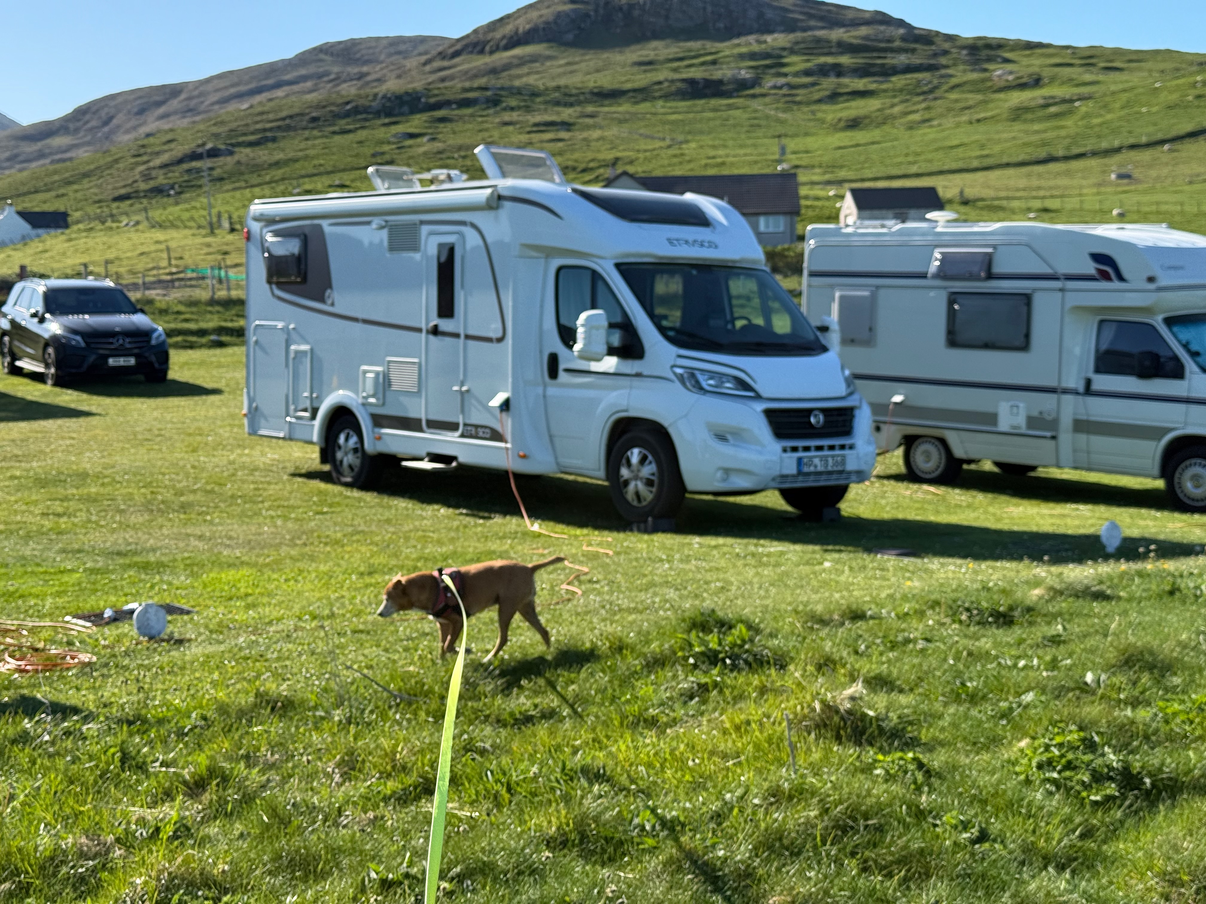 Wir erreichten Castlebay rund 1 Stunde vor der veranschlagten Zeit, was ich gerne annahm, und der restliche verbleibende Weg zum Wavecrest Campingplatz war mit rund 4 km sehr überschaubar. Dort angekommen wurde ich direkt mit Namen begrüßt und in unseren Stellplatz eingewiesen. Die Leute waren wirklich sehr nett und Momo, Nana und ich fühlten uns wirklich sehr gut aufgenommen. Die kleinen Campingplätze haben einfach eine sehr familiäre Stimmung.