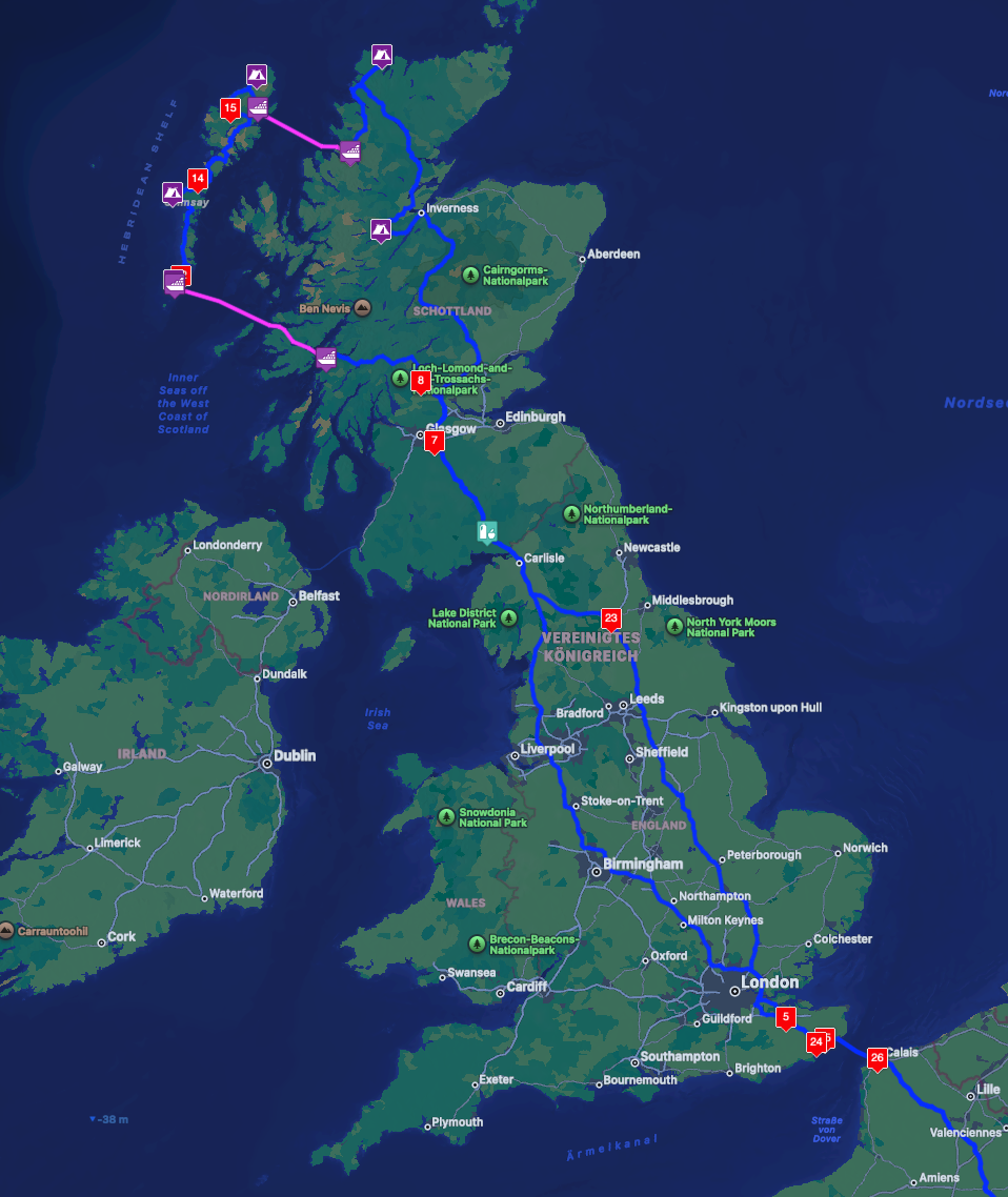 Dieses Mal geht es zum ersten Mal auf die äußeren Hebriden. Ich kann nur hoffen, dass das Wetter gnädig ist, da davon doch sehr viel abhängt. Schlechtes Wetter bedeutet zum einen, dass unter Umständen die Fähren nicht fahren. Das wäre fatal. Schlechtes Wetter bedeutet aber auch, dass die Inseln so weit draußen ihren Zauber nicht wirklich entwickeln können. Wie dem auch sei, ich kann nur hoffen. Wie bereits in den Jahren zuvor geht es auch dieses Mal wieder durch Frankreich zum Tunnel. Trotz nicht ganz unerheblicher Mautgebühren ist das Fahren da aber deutlich entspannter gewesen als über Belgien. Es geht also von funThoms Lair zum Eurotunnel in Calais. Die Durchfahrt ist für den späteren Nachmittag geplant, es sollte also genug Zeit für die Hinfahrt vorhanden sein. Nach der Durchfahrt geht es noch bis zur Bearsted Campsite, die rund 30 km vom Tunnel entfernt liegt. Diesen Weg habe ich mir für den nächsten Tag dann schon einmal gespart. Die Fahrt dorthin dauert wahrscheinlich nicht viel länger als bis zur Daleacres Campsite, da es fast komplett Motorwaystrecke ist.