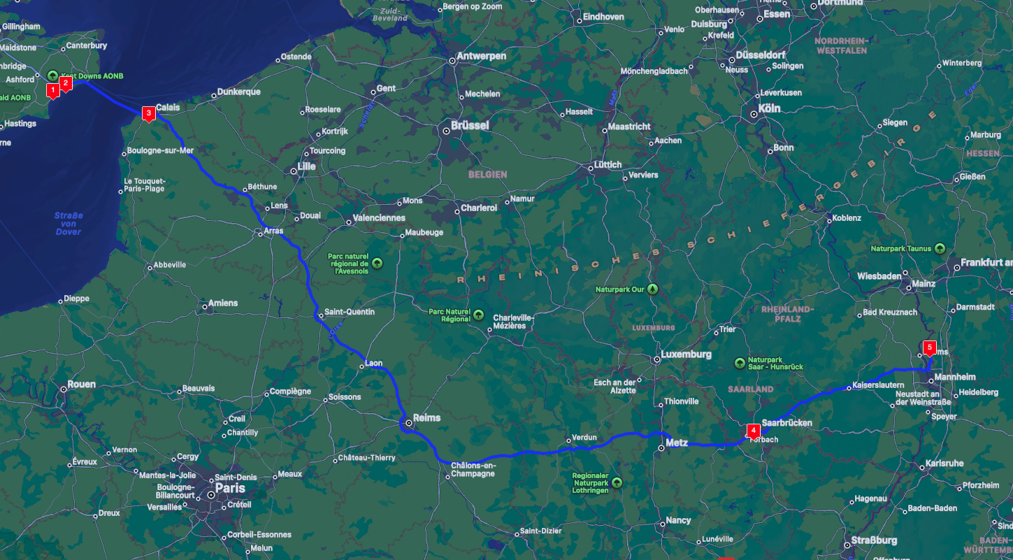 Und dann heißt es auch schon wieder Good Bye Great Britain. Von Daleacres geht es zum Tunnel, dann rüber auf den Kontinent und zurück zu funThoms Lair. Wie mittlerweile gewohnt die Route durch Frankreich über Saarbrücken Richtung Mannheim und dann sind wir auch schon wieder zurück